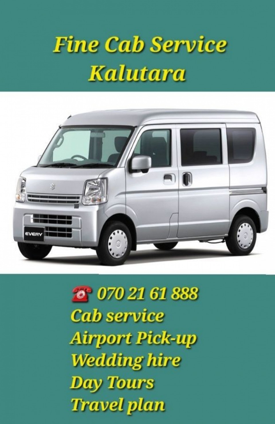 අපගේ හුහදශීලී 24 පැය ඉක්මන් සේවය. අවම ගාස්තු 1km කට රු 70/- 80/- 100/- 120/- මිල ගනන් යටතේ පලපුරුදු රියදුරන් සමග නිදහසේ විශ්වාසයෙන් ගමන් යන්න. අදම අමතන්න. ෆයින් කැබ් සර්විස් කලුතර
